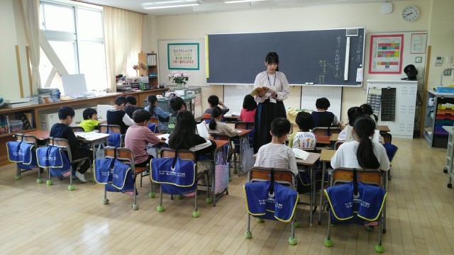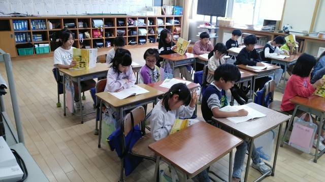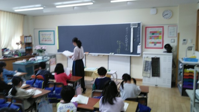 2年生の1時間目は、国語科の学習でした。「たんぽぽのちえ」というお話の先生の範読を聞いているところでした。