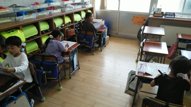 1年生は、5時間目に算数のプリントを進めていました。