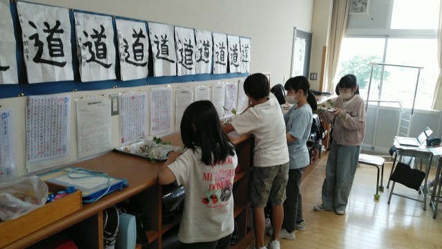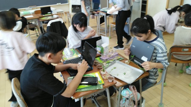 5年2組の1時間目は、理科の学習でした。発芽した大豆を観察していました。