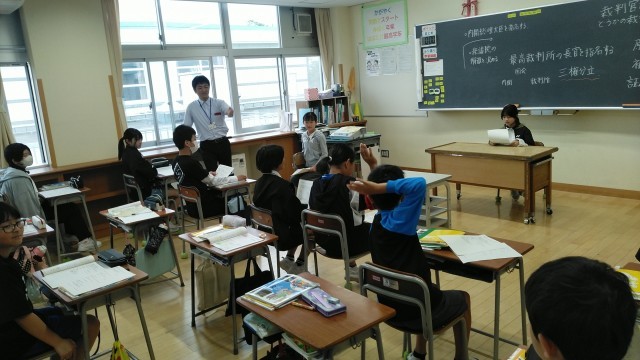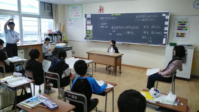 6年生の1時間目は、社会科の学習でした。模擬裁判をやってみていました。
