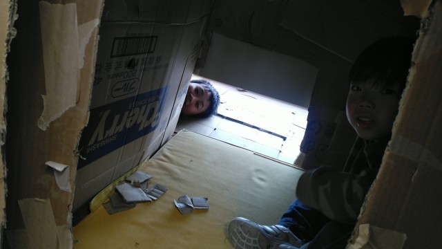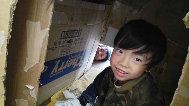 つばめ野級2組は、1時間目に段ボールハウスの中にいました。