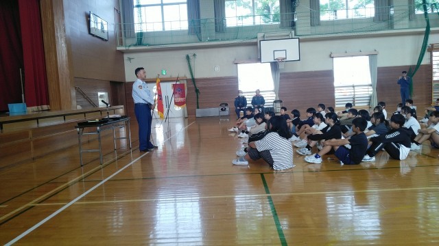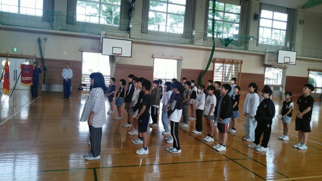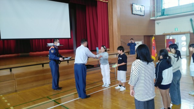 3時間目に体育館で5年生の「BFCバッチ授与式」がありました。富山北消防署和合出張所の所長さんからBFCバッチと本等をいただきました。