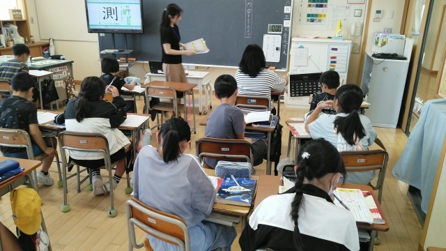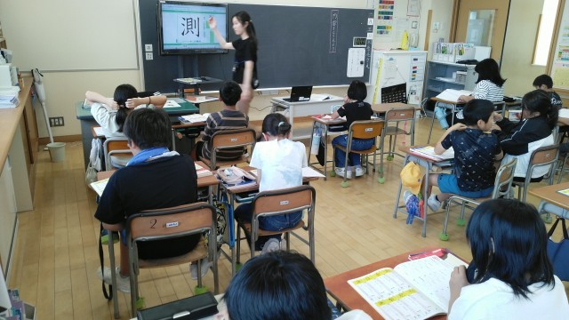 5年1組の3時間目は、国語科の学習でした。「測」という漢字の練習をしていました。
