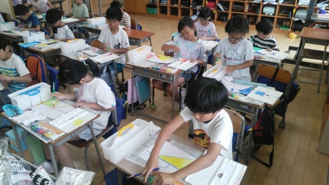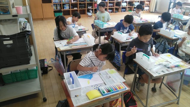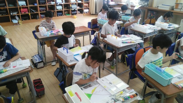 2年生の3時間目は、図画工作科の学習でした。水彩道具を上手に使って、色を塗っていました。
