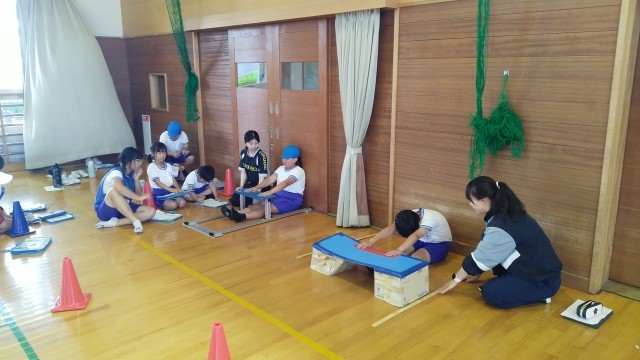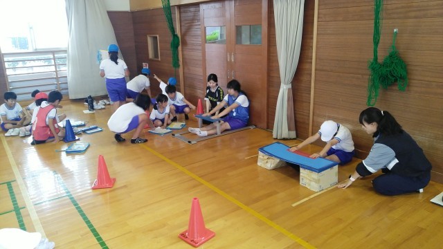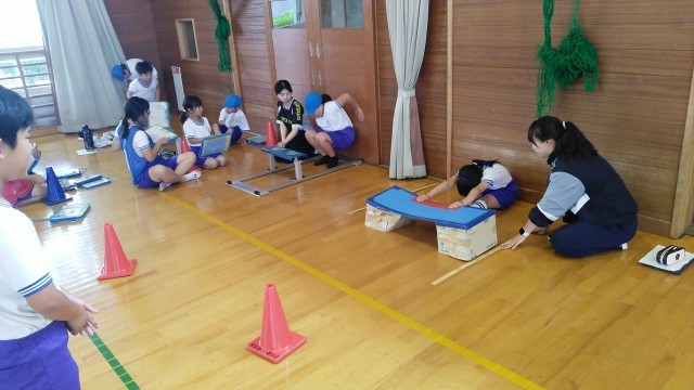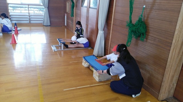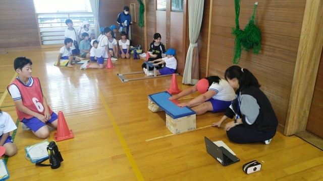 ひいらぎタイム~5時限目に、ファミリー班ごとにスポーツテストを行いました。長座体前屈の様子です。