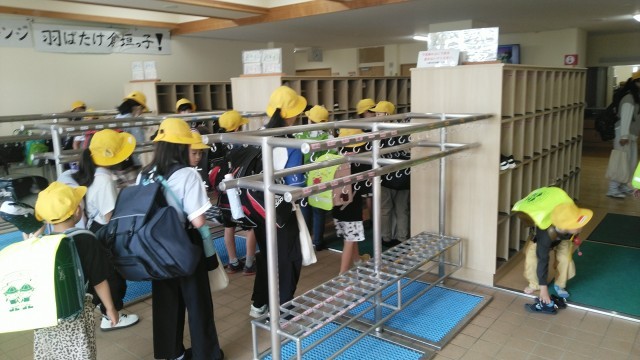 今朝の児童玄関の様子です。5・6年生は、来週予定の宿泊学習の大きな荷物を持って登校して来ました。