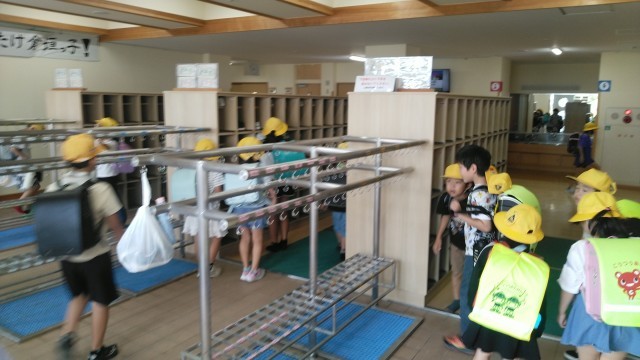 今朝の児童玄関の様子です。晴れた気持ちのよい朝です。子供たちが元気に登校して来ました。