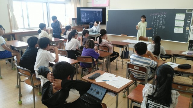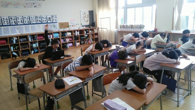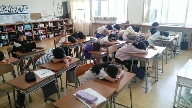 5年2組では、5時間目にどんな活動をしたいのかを目を閉じて挙手する方法で確かめていました。