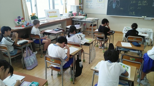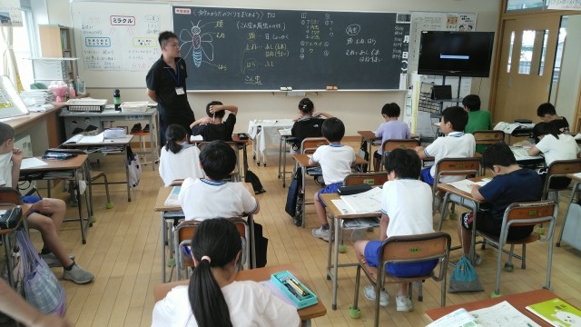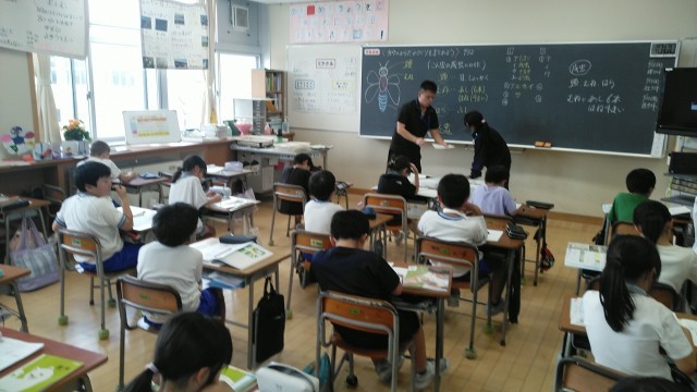 3年生の5時間目は、理科の学習でした。こん虫の足はどこに何本あるかを考えていました。