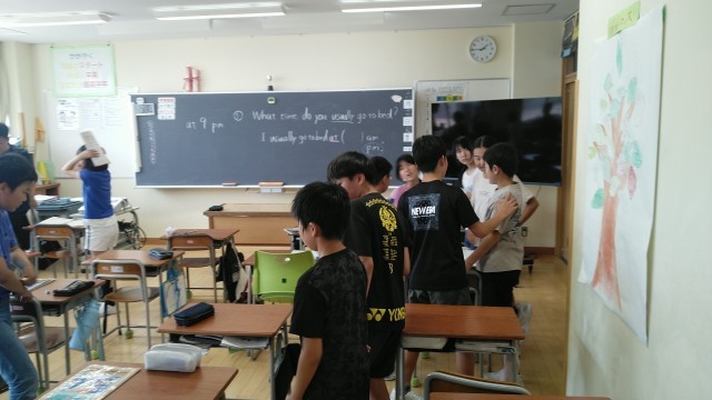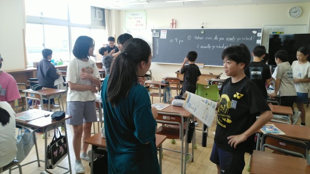 6年生の5時間目は、外国語科の学習でした。普段何時頃に寝るかを英語で聞いていました