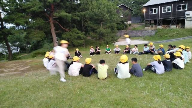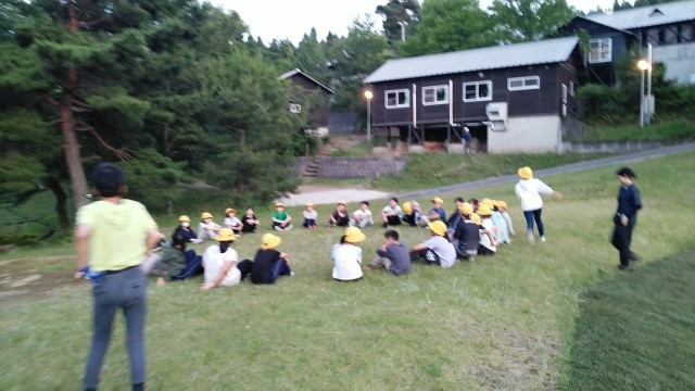 19:00からキャンプファイアを行いました。最初のゲームのハンカチ落としをしています。