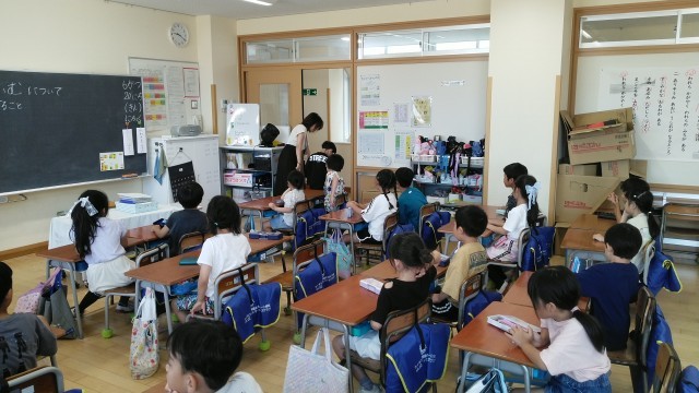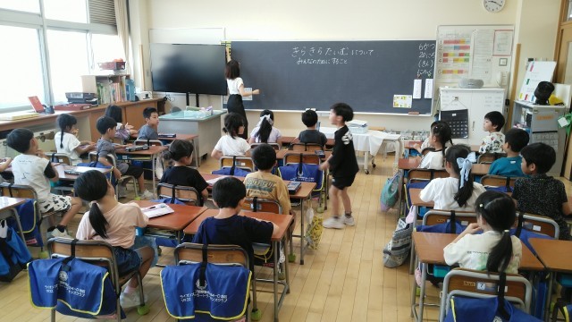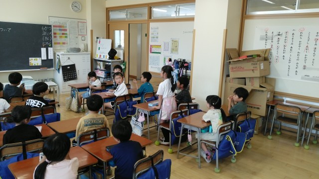 1年生は、1時間目にきらきらタイムのふりかえりをしていました。どんな気持ちで何をしているのか等を友達に紹介していました。