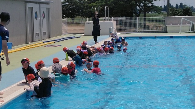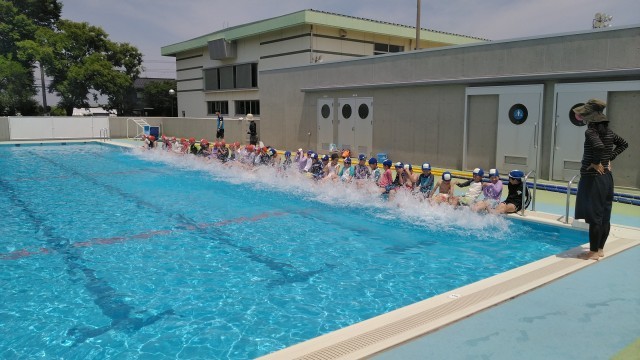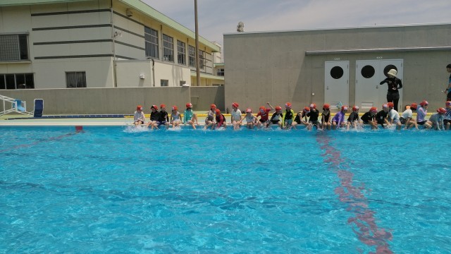 1・2年生は、3時間目にプールに入りました。手や足で水をかけあったあと、プールに入りました。1年生は、初めての小学校のプールを楽しんでいました。