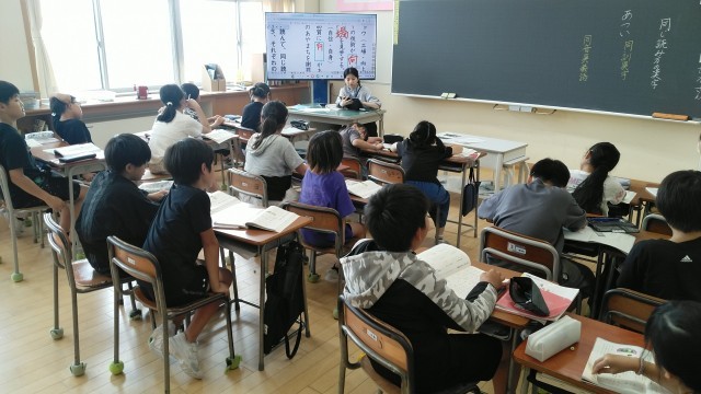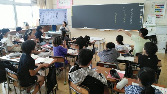 5年2組の5時間目は、国語科の学習でした。同音異義語を入れて漢字の問題を答えていました。
