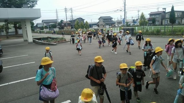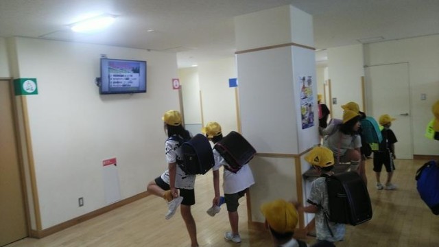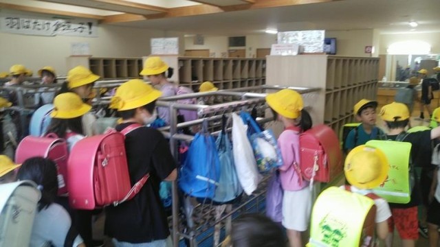 今朝の児童玄関の様子です。少し雨が降っていました。子供たちは、元気に登校してきました。