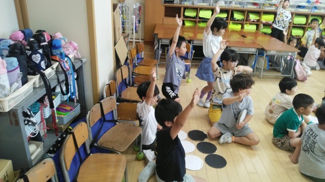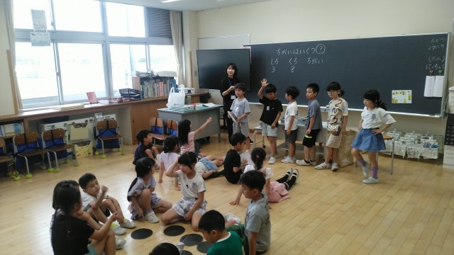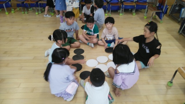 1年生の1時間目は、算数科の学習でした。グループごとに白と黒の大きなオセロの数の違いを考えていました。