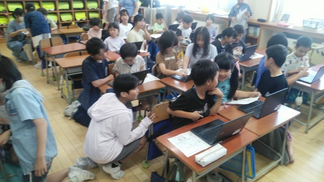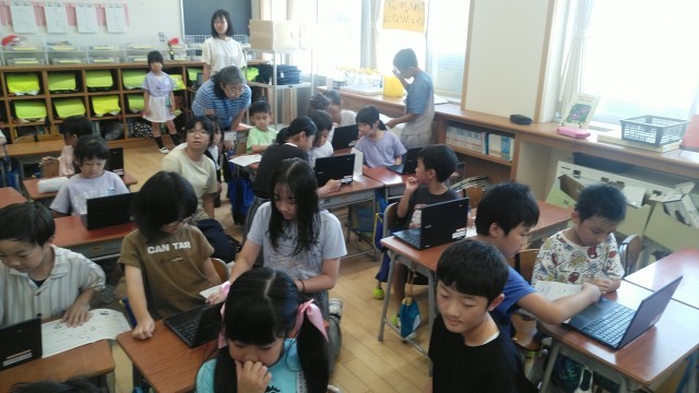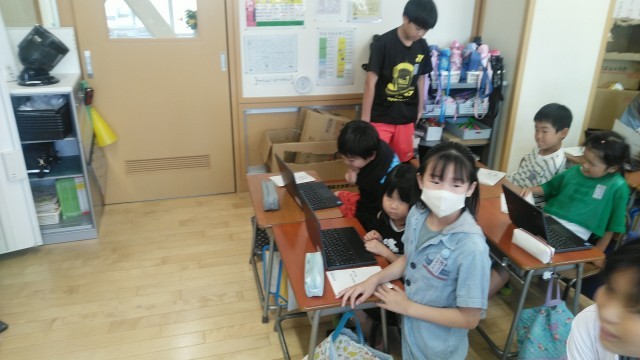3時間目に1年生教室に行くと、1年生と6年生がクロームブックを触っていました。1年生が使ってみるのを6年生がサポートしているみたいです。6年生さん、ありがとうございます。