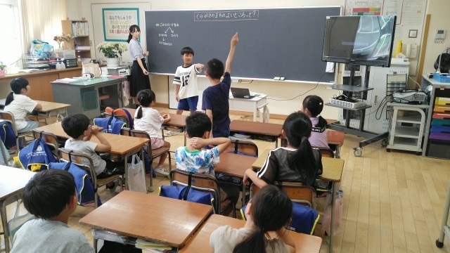 2年生の1時間目は、生活科の学習でした。「倉垣のよいところ」について話し合っていました。