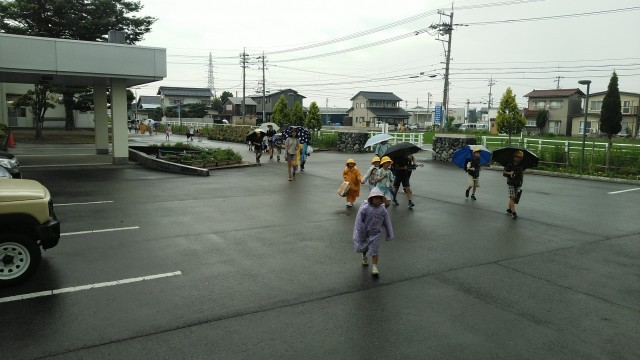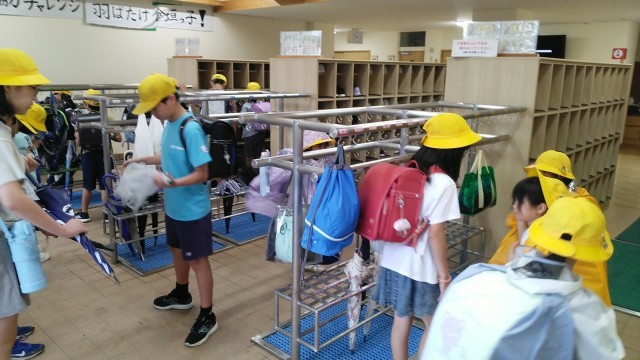 今朝の児童玄関の様子です。雨が降っていました。子供たちは、元気に登校してきました。