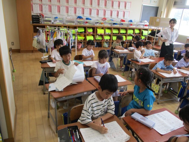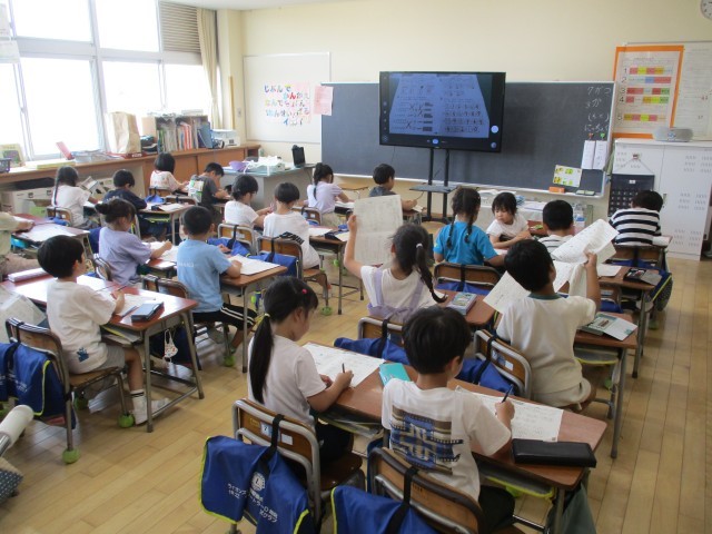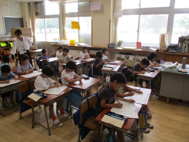 1年生の2時間目は、国語科の学習でした。プリントの直しをしていました。