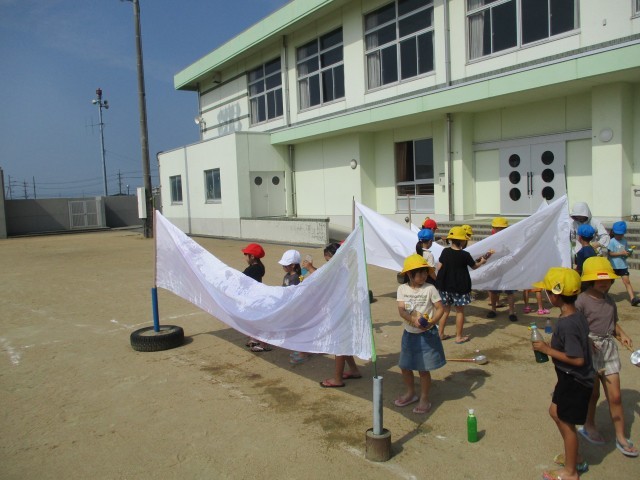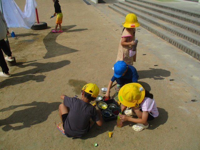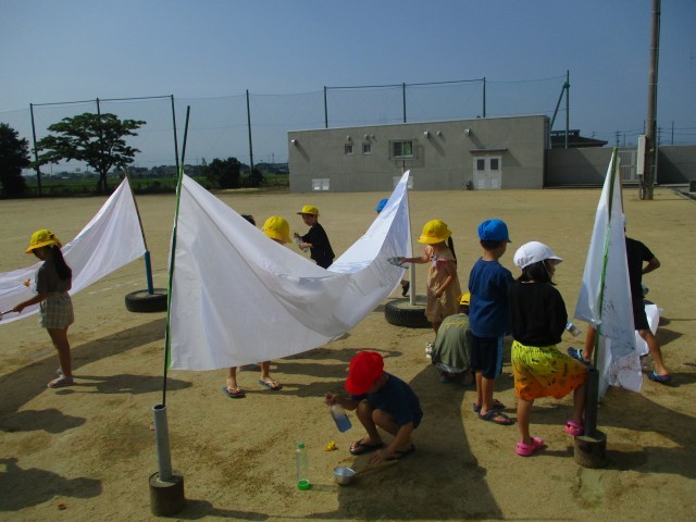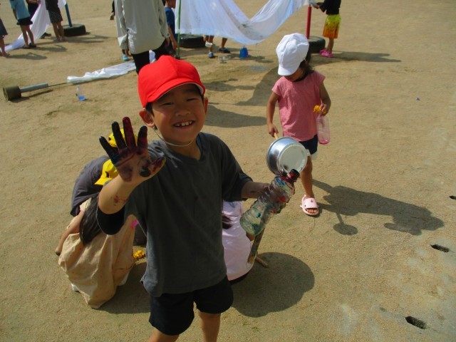 かべの様にはってある障子紙に思い思いにつくった色水をぶっかけて楽しんでいました。子供たちの笑顔がとってもすてきでした。