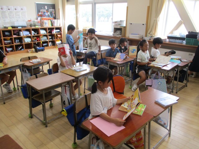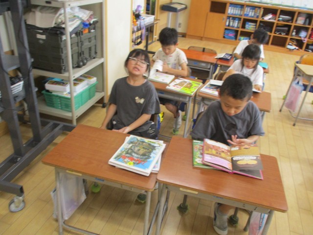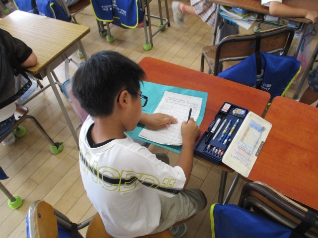 2年生は、5時間目に本を借りていました。教室に帰ると、読書ちょきんの用紙に題名等を書いていました。