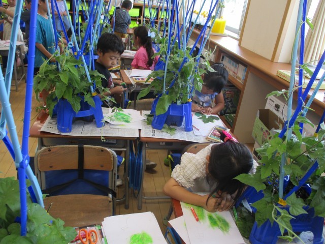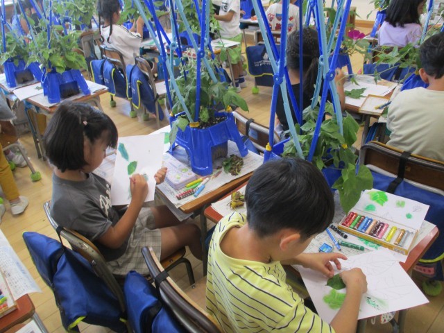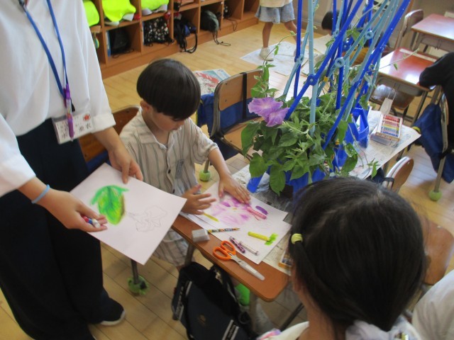 1年生は、自分が育てているアサガオの葉や花をじっくりと観察し、クレヨンや色鉛筆を使って絵を描いていました。紙に色付けたクレヨンを指でこすると、優しい色が生まれ、子供たちは様々な色を楽しんでいました。