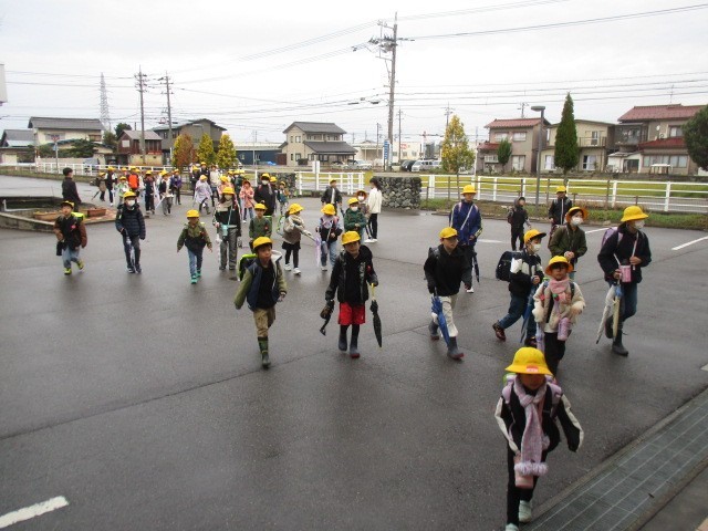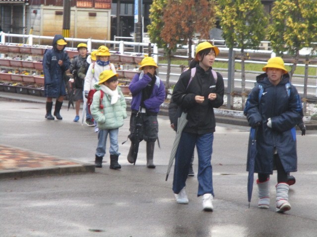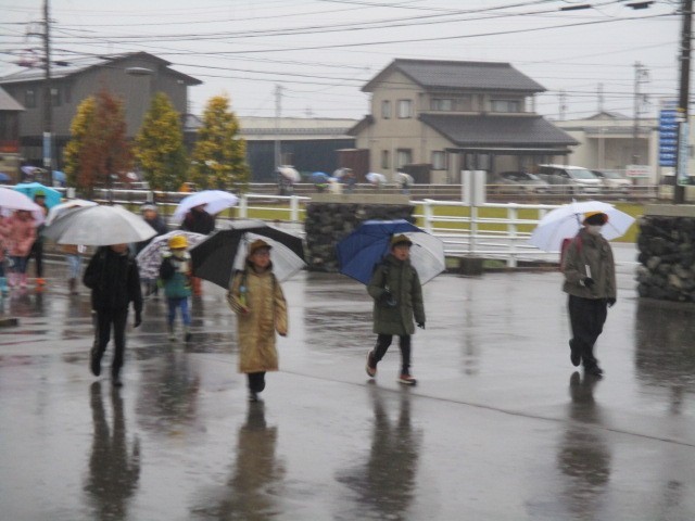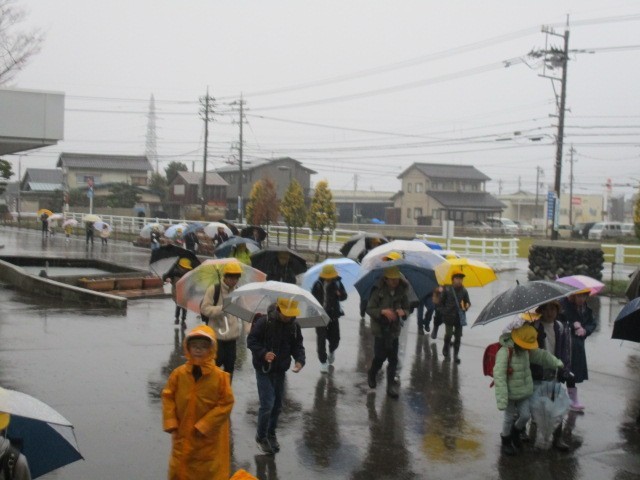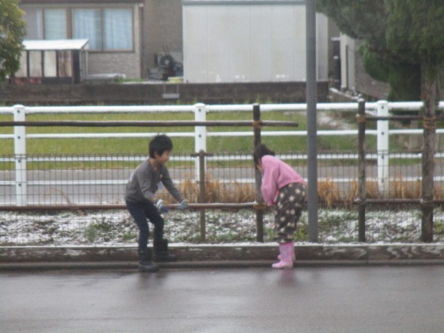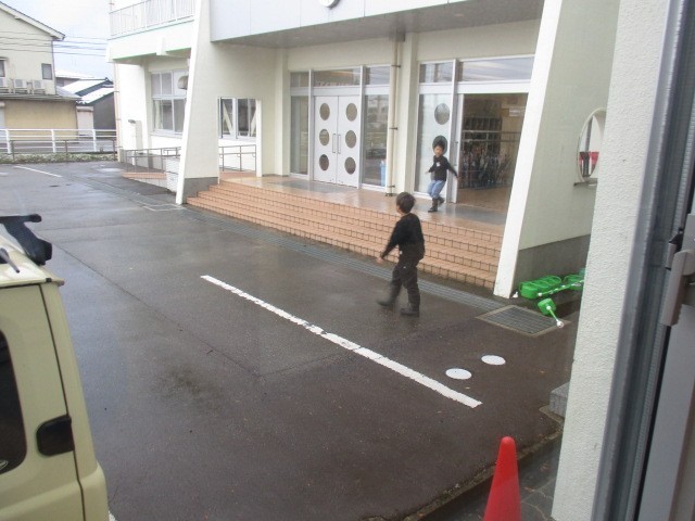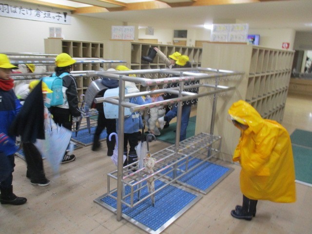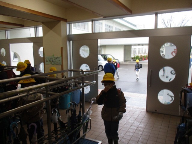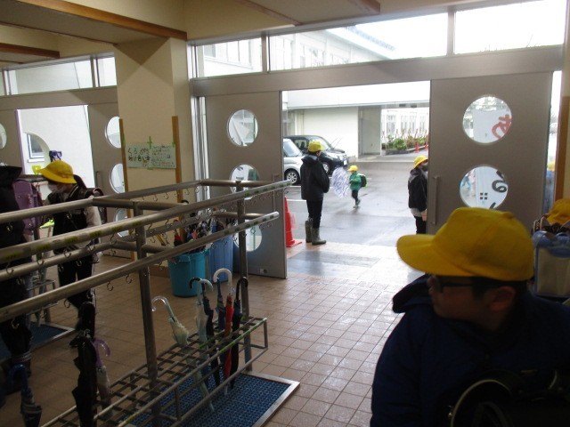 今朝の児童玄関の様子です。冷たい雨の降る朝です。少ししろいものも混じっています。子供たちは。元気に登校してきました。