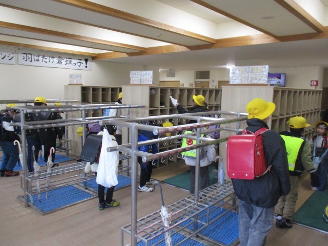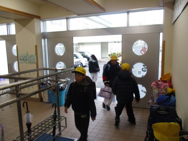 今朝の児童玄関の様子です。冷たい雨の降る朝です。少ししろいものも混じっています。子供たちは。元気に登校してきました。