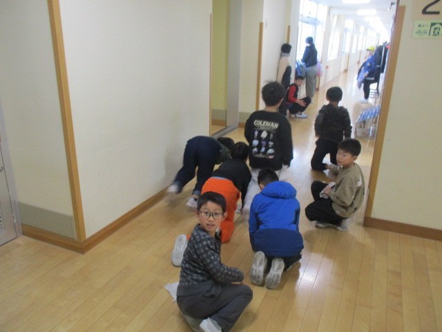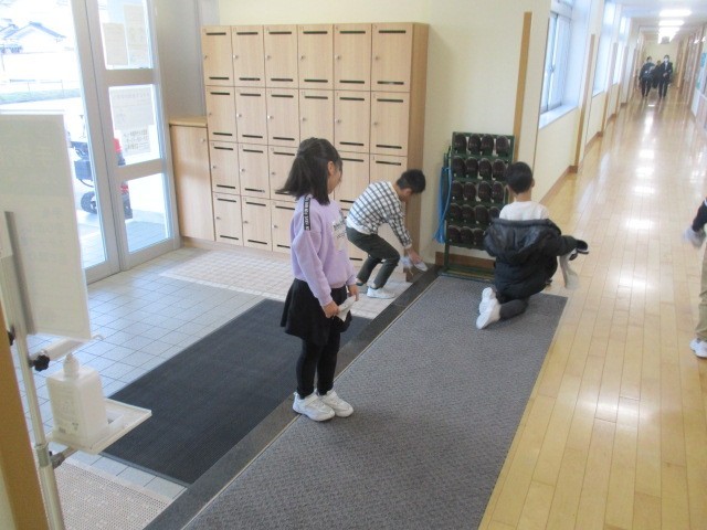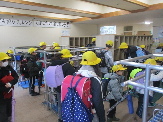 今朝の児童玄関の様子です。寒い朝です。子供たちが元気に登校してきました。