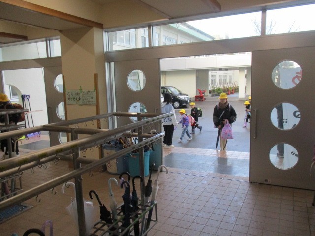 今朝の児童玄関の様子です。雨はあがっていました。子供たちが元気に登校してきました。