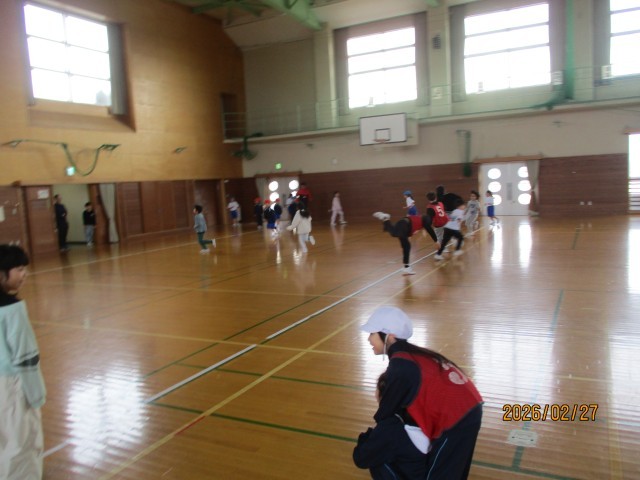 昼休みに体育館で運動委員会主催の「5・6年生ぞうきんリレー」の試合がありました。単純ですが、大変盛り上がっていました。