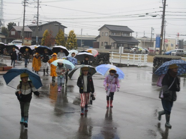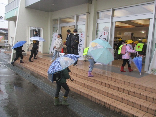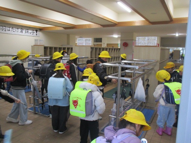 今朝の児童玄関の様子です。雨の朝です。子供たちが元気に登校してきました。