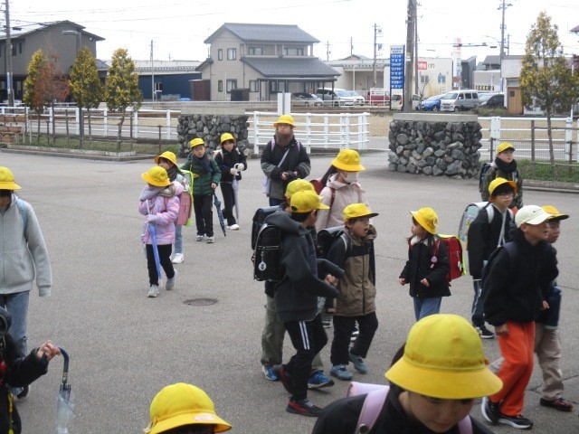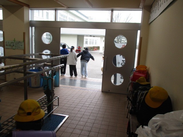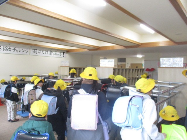 今朝の児童玄関の様子です。曇り空ですがだいぶん暖かくなってきました。子供たちの挨拶はとても元気です。