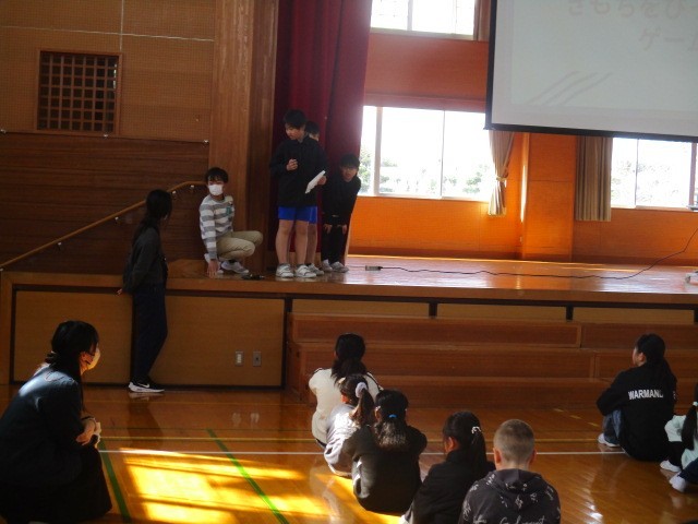 今日のぐんぐんタイムの卒業を祝う週間のイベントは、白団の交流活動でした。班長の好みをみんなで考えるゲームをして盛り上がっていました。