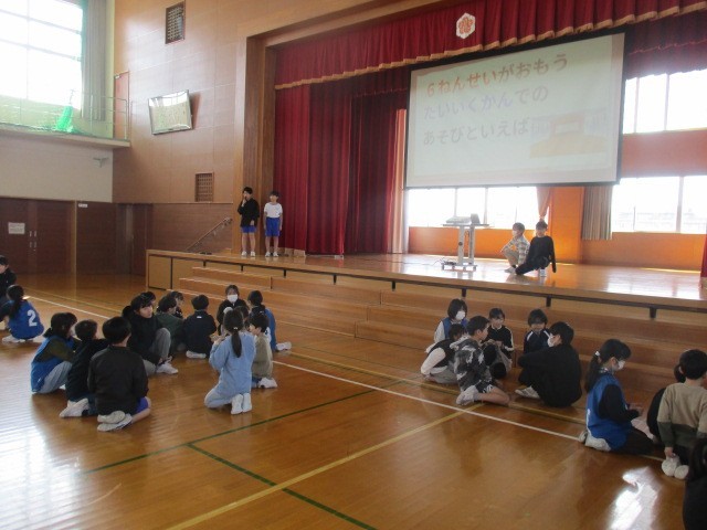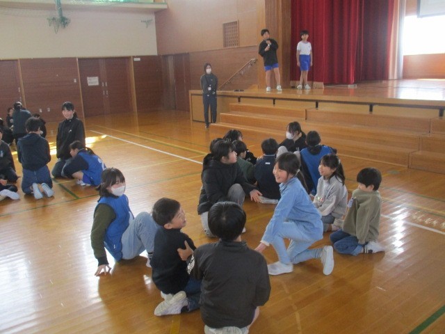 今日の卒業を祝う週間のイベントは、ぐんぐんタイムに体育館で青団交流でした。「6年生さんが思うグラウンドでの遊びは?」等、6年生さんの答えを予想してみんなで声を合わせて言うというゲームをしていました。6年生さんと答えがあった人は6年生さんとハイタッチできるそうです。とても盛り上がっていました。明日は、「卒業を祝う集会」があるそうです。