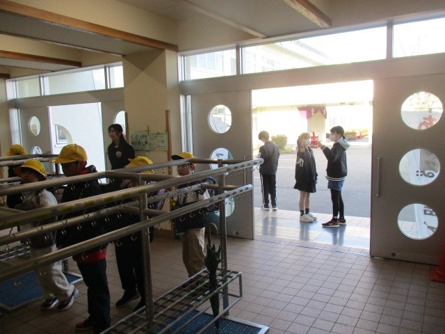 今朝の児童玄関の様子です。雨です。子供たちの挨拶は元気です。