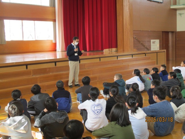 今日は、ALTの先生の最後の授業です。入学式の歌練習の後、倉垣っ子の前でスピーチをしてくださいました。「もっと見て、もっと聞いて、もっと話して、英語を学習しましょう」と英語で話されました。倉垣っ子も「Thank you」と感謝を伝えていました。
