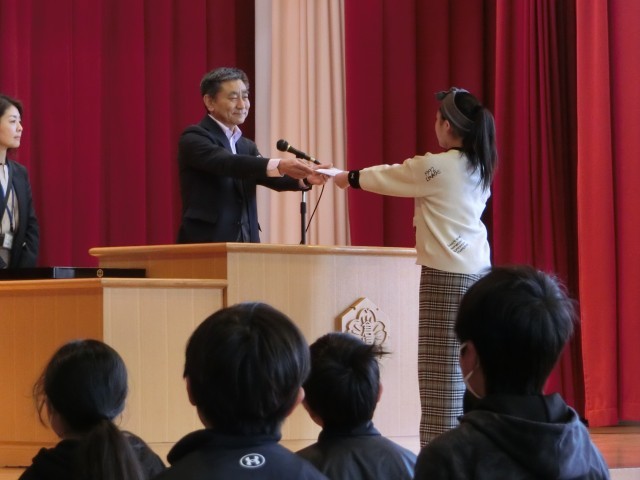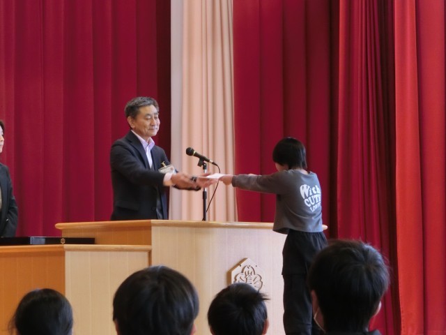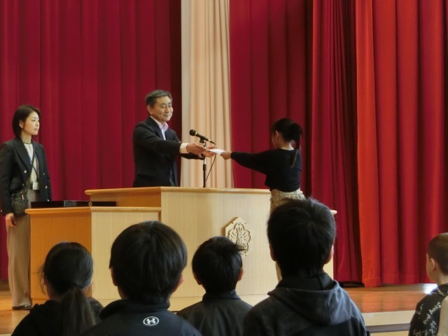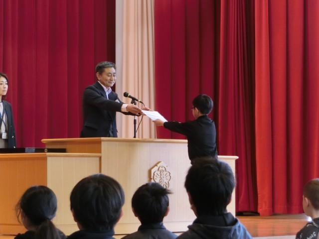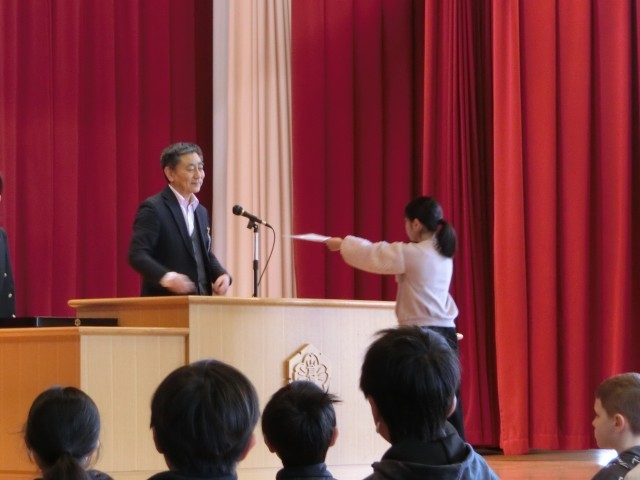 修了式を行いました。まず、各クラスの代表に修了証が渡されました。