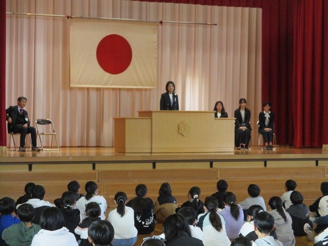 今年度末は、5名の先生方が異動となりました。離任式を行いました。5人の先生方の挨拶の様子です。