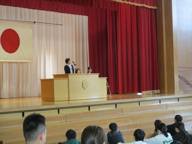 修了式を行いました。まず、各クラスの代表に修了証が渡されました。