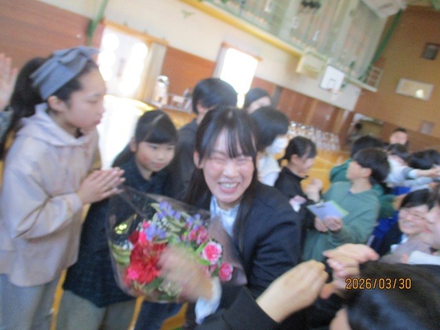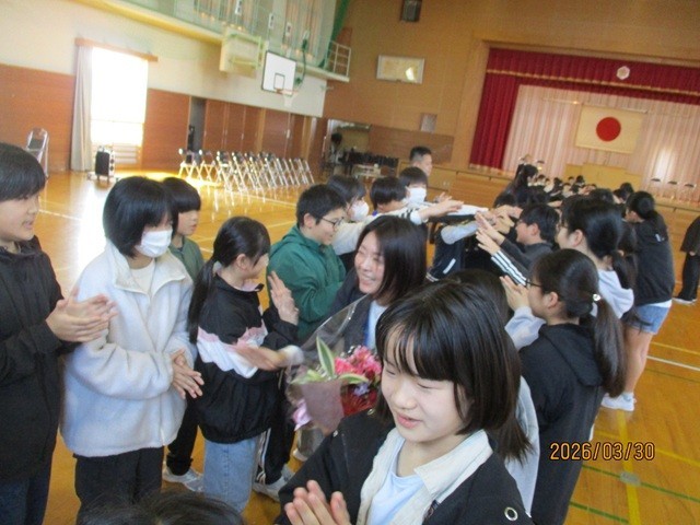 • 3月30日(月) 1~6年生 離任式(花束を…)