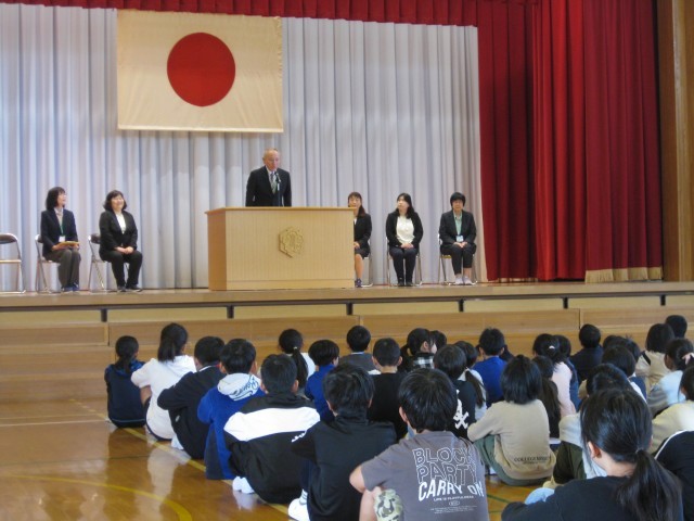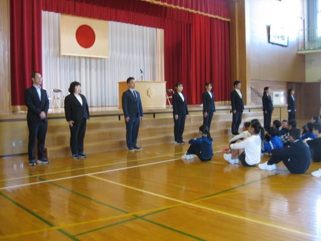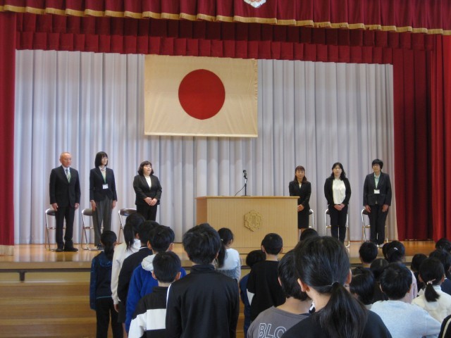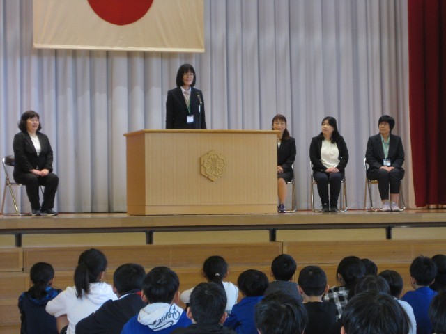 今年度末は、5名の先生方が異動となりました。離任式を行いました。5人の先生方の挨拶の様子です。