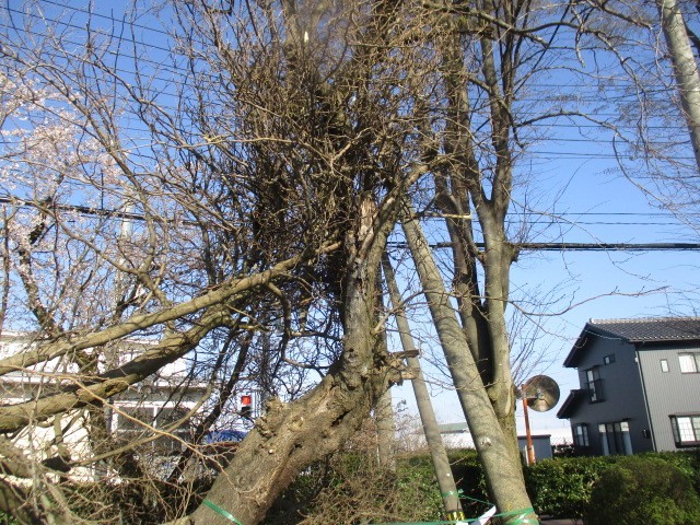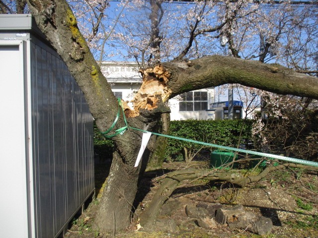 体育館南側の駐車場横にある木が先日の強風により折れました。