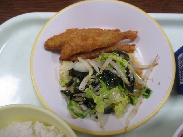 今日の献立は、「ごはん、牛乳、わかさぎのフリッター、わかめのチョナムル、にくどうふ」です。