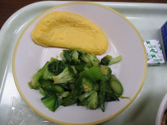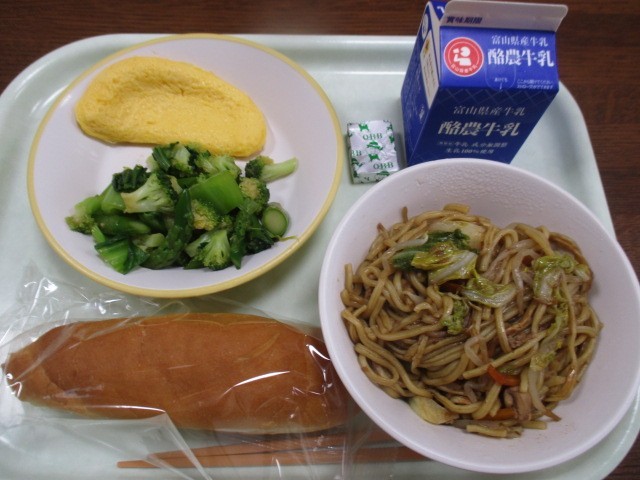 今日の献立は「コッペパン、牛乳、オムレツ、グリーンサラダ、焼きそば、ポケットチーズ」でした。