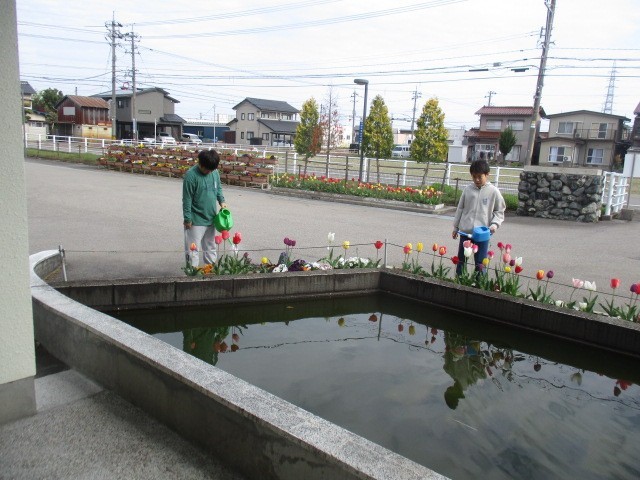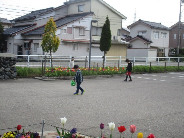 おはようございます。今日の始まりです。前庭では子供たちがチューリップに水やりをしています。