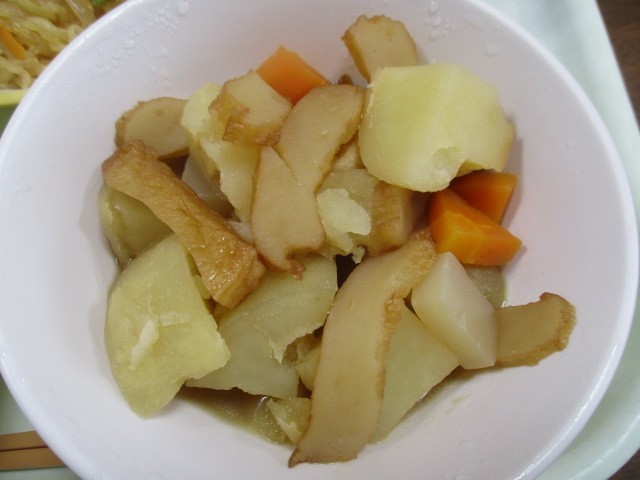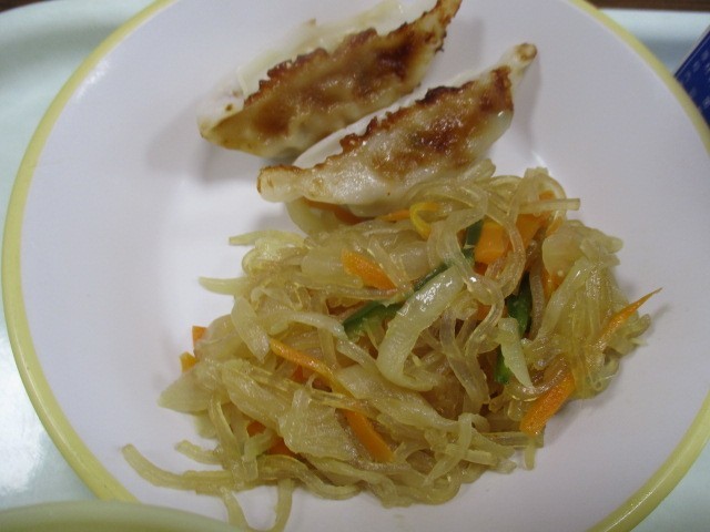 今日の献立は「ごはん、牛乳、焼き餃子、はるさめのピリ辛炒め、関東炊き、大豆ふりかけ」でした。