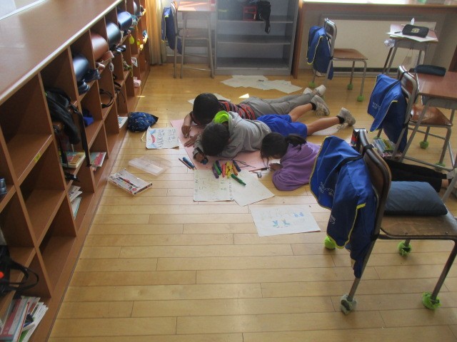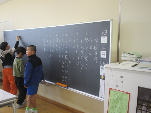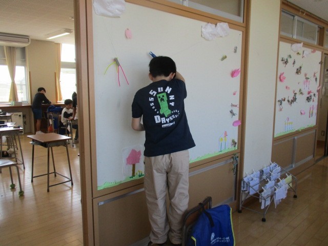 学級目標をつくる子、廊下のの掲示物を外す子、教室内の掲示物をつくる子、分担して自分たちのくらしづくりを行ってます。