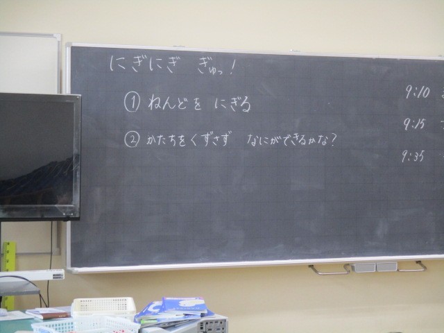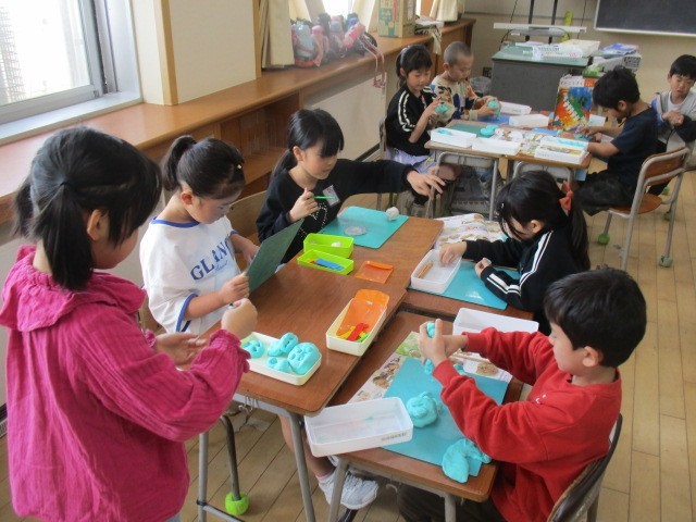 粘土をにぎって、いろいろな形をつくって楽しみました。グループで活動することで仲間の形のよさに気付いていました。